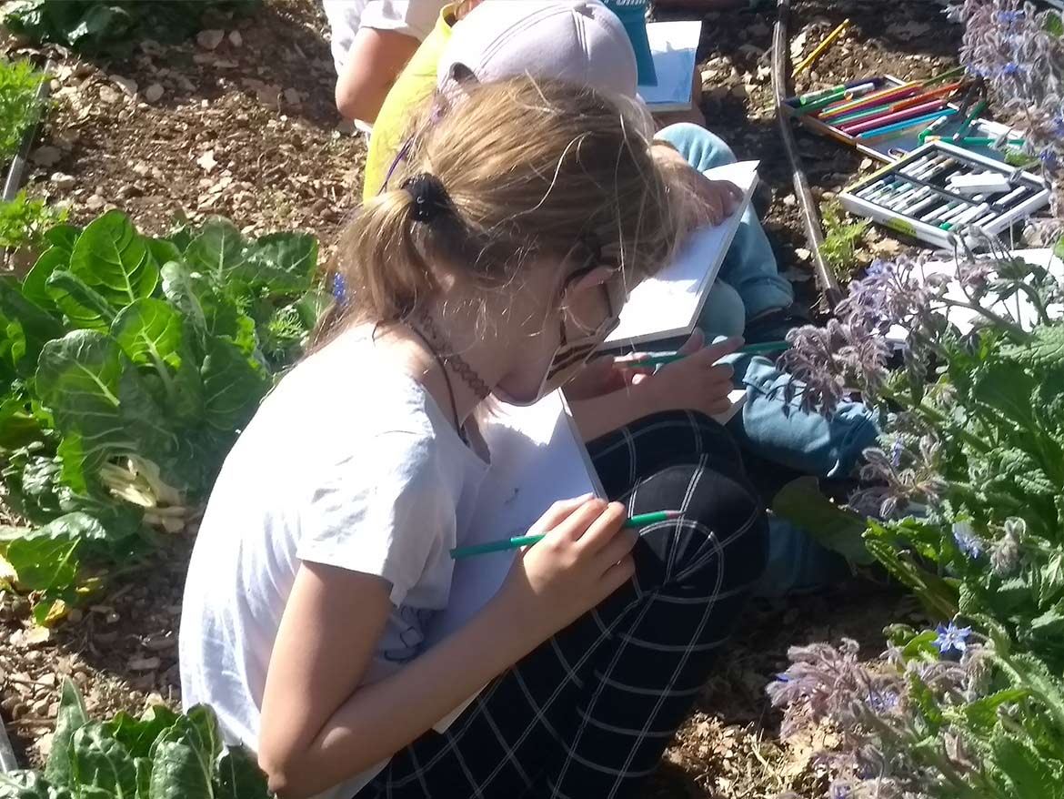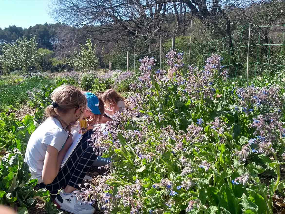Aujourd’hui, avec l’arrivée des premières fleurs, les enfants se sont lancés dans une observation des abeilles qui butinent les fleurs du potager.
